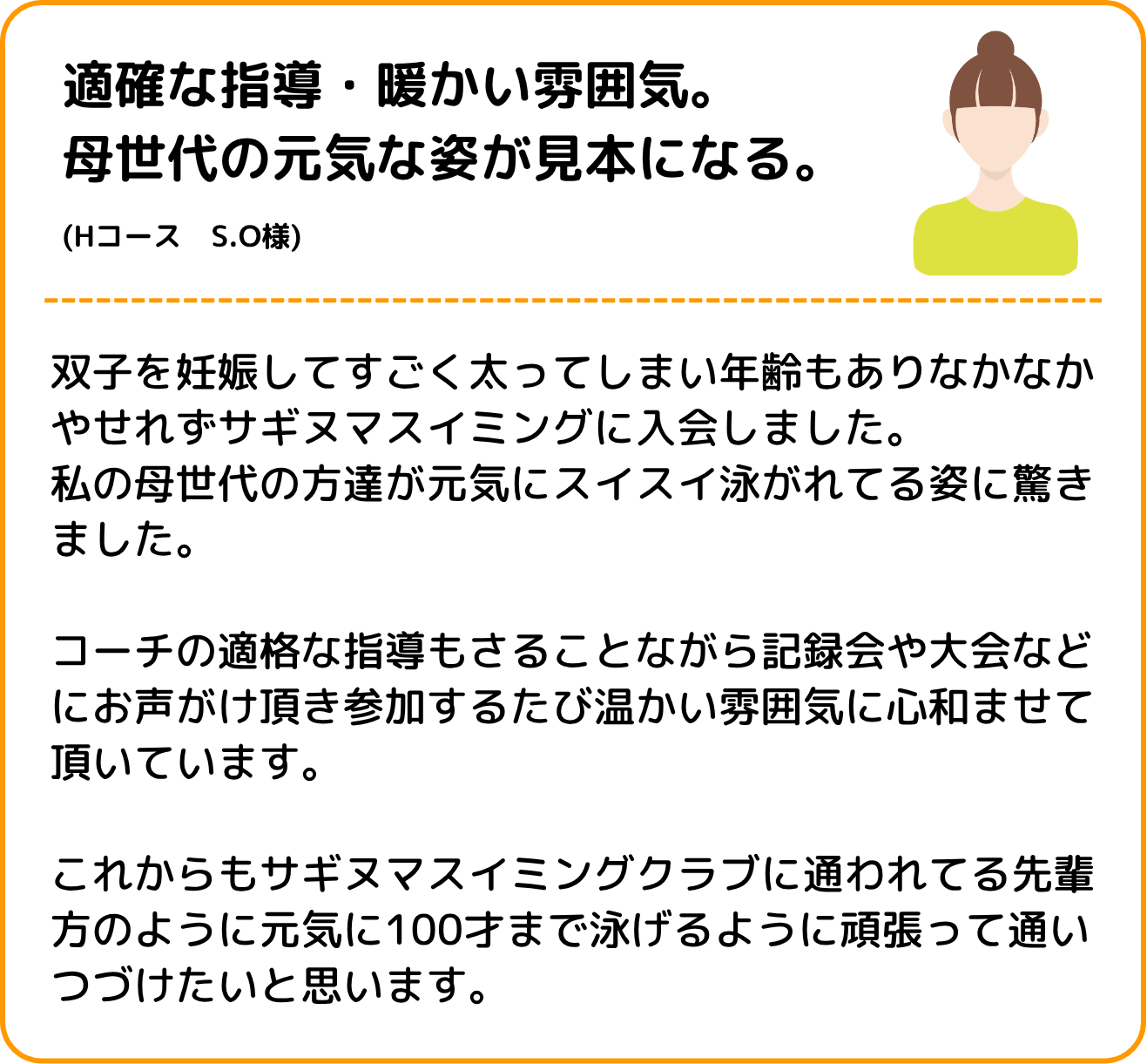 コーチが一人ひとりの泳力、目的を考えて指導するため、初心者から競技志向の方まで、幅広くご利用いただけます。泳げるようになりたい、日頃の運動不足解消をしたい、競技力を向上したいなど、ぜひお任せください。