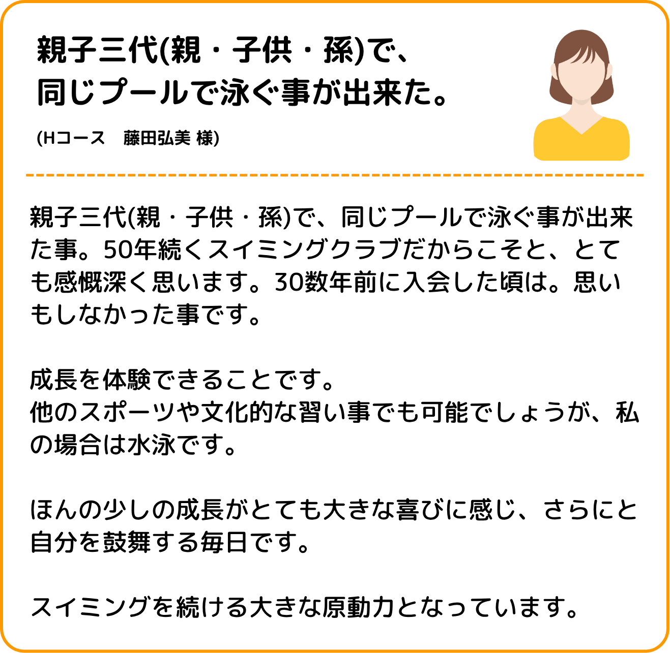 20代から80代まで、幅広い年代の方が水泳という共通の趣味を通して、お互いに刺激を受け合いながら練習や大会に参加しています。